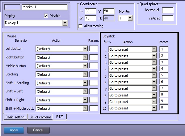 The following example is valid only for cameras in configuration of which there is PTZ control panel. When configuring Video surveillance monitor select the Go to preset action with 1,2,3...,0 parameters for ten joystick buttons (see Assigning commands to joystick buttons using the Monitor section of Installing and configuring security system components guide).