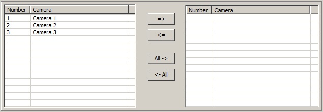 Use the  button to replace all cameras from the left list to the right list, use the  button to replace all cameras from the right list to the left list.