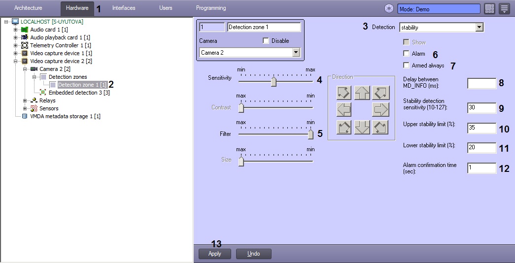 Decreasing the Filter parameter means that it is less probable that detection tool will trigger at objects the color gamut of which is close to the background color gamut. Increasing the Filter parameter means that it is more probable that the detection will trigger at the video signal noise. The best value of the Filter parameter is identified by testing the detection tool for triggering under the required conditions. In most cases, the default value is enough. To enable the auto recording option on a stability detection tool alarm and generate alarm for the corresponding camera, set the Alarm checkbox (6).