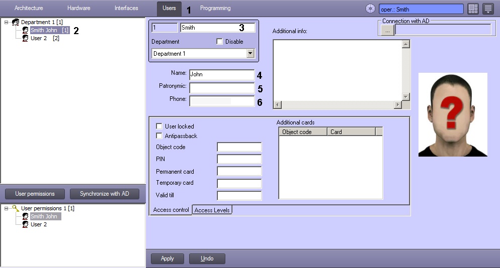 Create a User object under the Department object in the objects tree (2). In the Name field enter the username (the user's last name if the Access Manager module is in use).