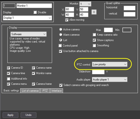 By default, the PTZ control option with the use of the Monitor object is disabled. To enable the PTZ control option, the control priority must be set for the Monitor object (see Installing and configuring security system components guide).