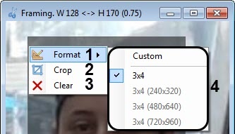 To select the preset size of the resulting photo or the aspect ratio of the rectangle, right-click, either on the selected area, or in the area not marked by the rectangle, and in the opened function menu select Format (1) → <required size or aspect ratio> (4).
