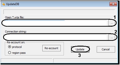 Log off the ACFA Intellect software before start working with the updateDB.exe utility.- Click the button near the Open file (*.wta) field and specify the path to the Intellect.wta file (1). This file is located in the Tools folder of ACFA Intellect software installation directory.