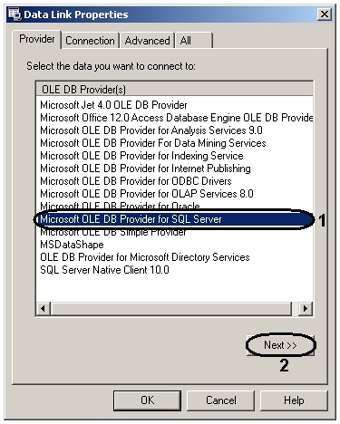 - Click the button near the Connection string field (2). The Data link properties dialog box is displayed. Set the connection the following way:
