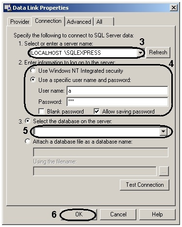 - In the 1. Select or enter a server name: enter the name of database server (3).