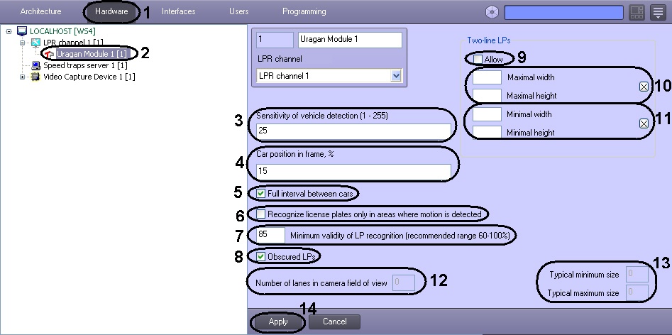 - The number of lanes defined by the Auto-Uragan program module will be displayed in the Number of lanes in camera field of view non-edited field (12).