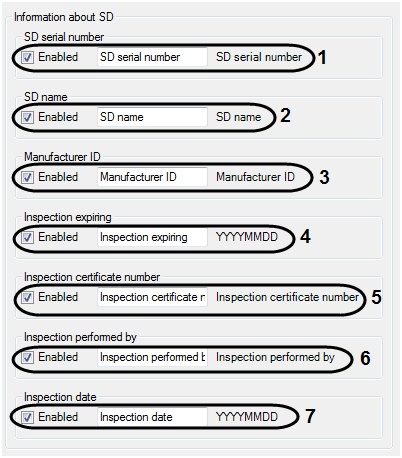 6. Add one or several speed detector parameters to the frame sign. Put a tick in the Enabled checkboxes for necessary parameters in the Information about SD group and then enter in the field or select the values of corresponding parameters from the list.