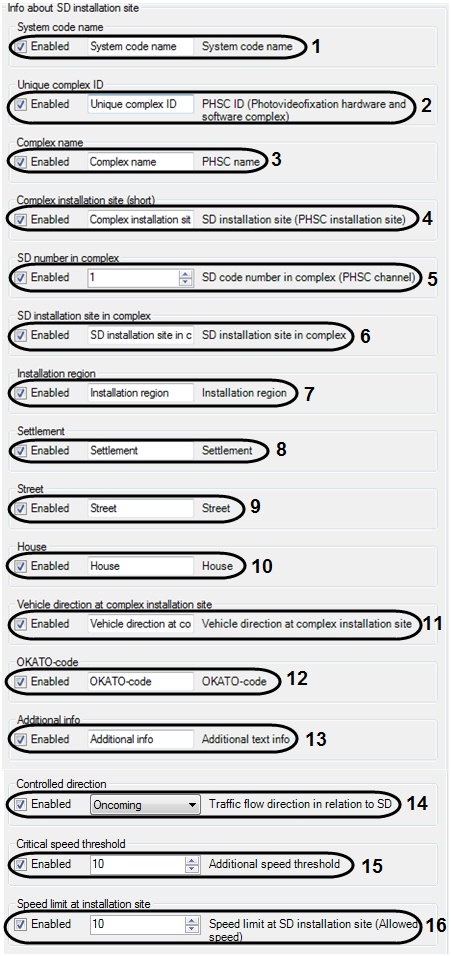 7. Add one or several speed detector parameters to the frame sign. Put a tick in the Enabled checkboxes for necessary parameters in the Info about SD installation site and then enter in the field or select the values of corresponding parameters from the list.