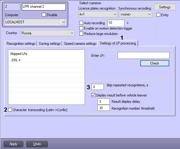 If it is necessary to ignore repeated license plate recognition, in the Skip repeated recognitions, s field, enter the time period in seconds greater than 0, during which the captured license plate should not be recognized again (3).