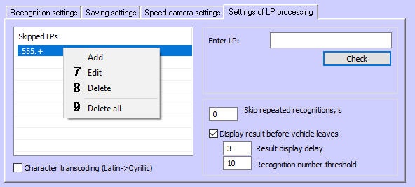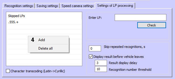 - Ignoring numbers that are contained in the predefined list of rules. Rules can contain either an exact number or a regular expression. This allows, for example, to ignore the LP numbers of a certain region.
