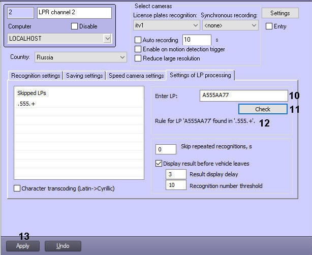 You can check if the specified rule is correct. To do this, enter the test LP in the Enter LP field (10) and click the Check button (11). The result will appear below in the field (12).