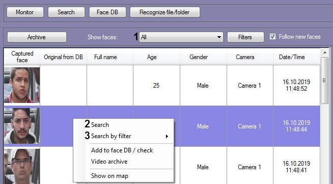You can also go to the face search by right-clicking on the image in the Face DB (4) or Cameras (5) sections (see Viewing information on recognized and unrecognized faces) and selecting the corresponding item.