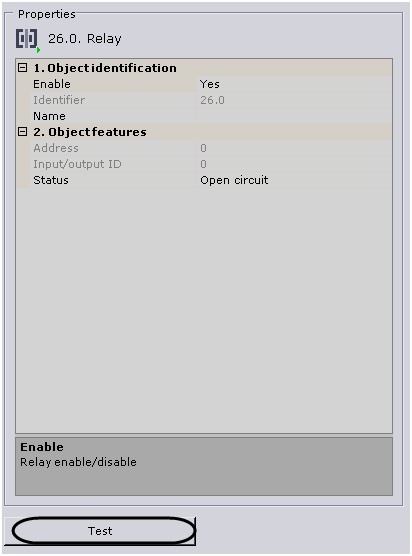 To check the functioning of the relay, click the Test button. If the relay is configured correctly, its status will briefly change.