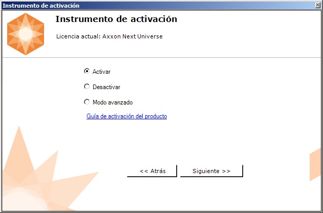 Existen 5 tipos de licencia del VMS Axxon Next: Demo, Free, Start, Professional y Universe. Inmediatamente después del software, éste se iniciará en el modo de demostración. El periodo de trabajo del sistema en el modo de demostración es de 08:00 a 18:00. Para el funcionamiento completo del sistema de seguridad deberá activar el VMS Axxon Next. La activación del software se realizará mediante la distribución de un fichero de licencia en el sistema.