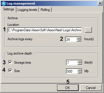 - In the Size field (4), indicate the maximum size of the archive, above which the oldest logs are deleted from the archive.