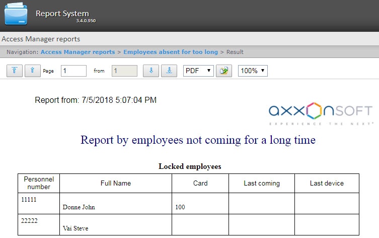 The Employees absent for too long report is a table which contains the information about the last passes of the employees who are absent for a long time. Absent means that their cards were not used for a specified number of days.