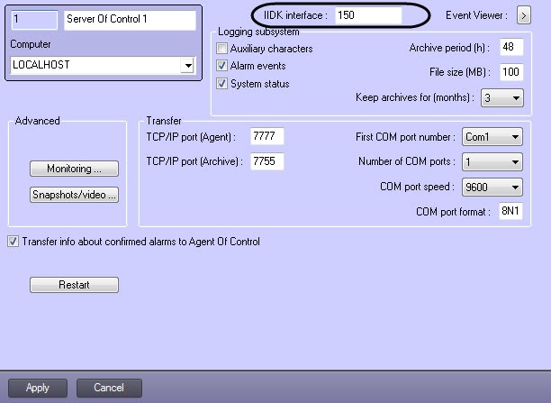 - When the Server of Control object is created its settings panel is displayed on the right of the System settings dialog box.