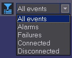 (Turn filter on/off).The left list displays only the objects with alarms or failures, the connected or disconnected objects only. The middle list displays time periods. If there was an alarm during the selected period, it is included on the list. The right list displays the alarm durations that trigger the filter. For example, if you set the filter to "Current"-"1 minute", only those objects are displayed that are currently in the alarm state and that have already been in this state for one minute or more. If you set the filter to "Day"-"5 hours", only those objects are displayed that have at least once been in the alarm state in the last 24 hours and that were in this state for at least five hours.