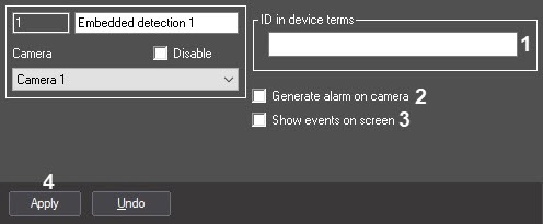 Set the Generate alarm on the camera checkbox if the alarm is to be generated on the camera by detector’s response (2).