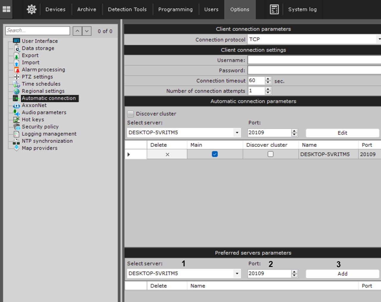 You can set Preferred Servers, which will be displayed at the top of the list when you launch Client (see Starting Axxon One Clientthe client). Also, preferred Servers are used for automatic connection: it primarily uses the Servers specified in the Automatic connection parameters group (see Automatic connection), and if these Servers are unavailable, then the system will try to connect to Servers from the Preferred servers parameters group in the set order.