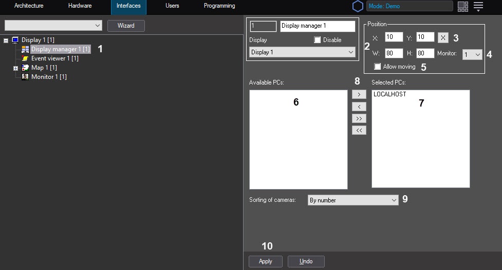 3. Set the Display manager window size and position manually (2), or click the X button (3) and specify the window size and position using the Specify dimensions Axxon PSIM Demo demo window:
