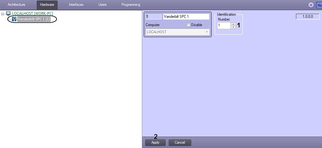 - Go to the Vanderbilt SPC object setup panel which is created on the base of the Computer object on the Hardware tab of the System settings dialog box.