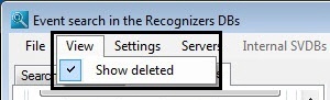 The External database group contains a list of all the databases that have ever been used together with the Vehicle Tracer module but, by default, databases removed from the Intellect software package are not displayed in the list. Select the Show deleted in the View menu of Event search in the Recognizers DBs main window to search by removed servers of plate recognizers.