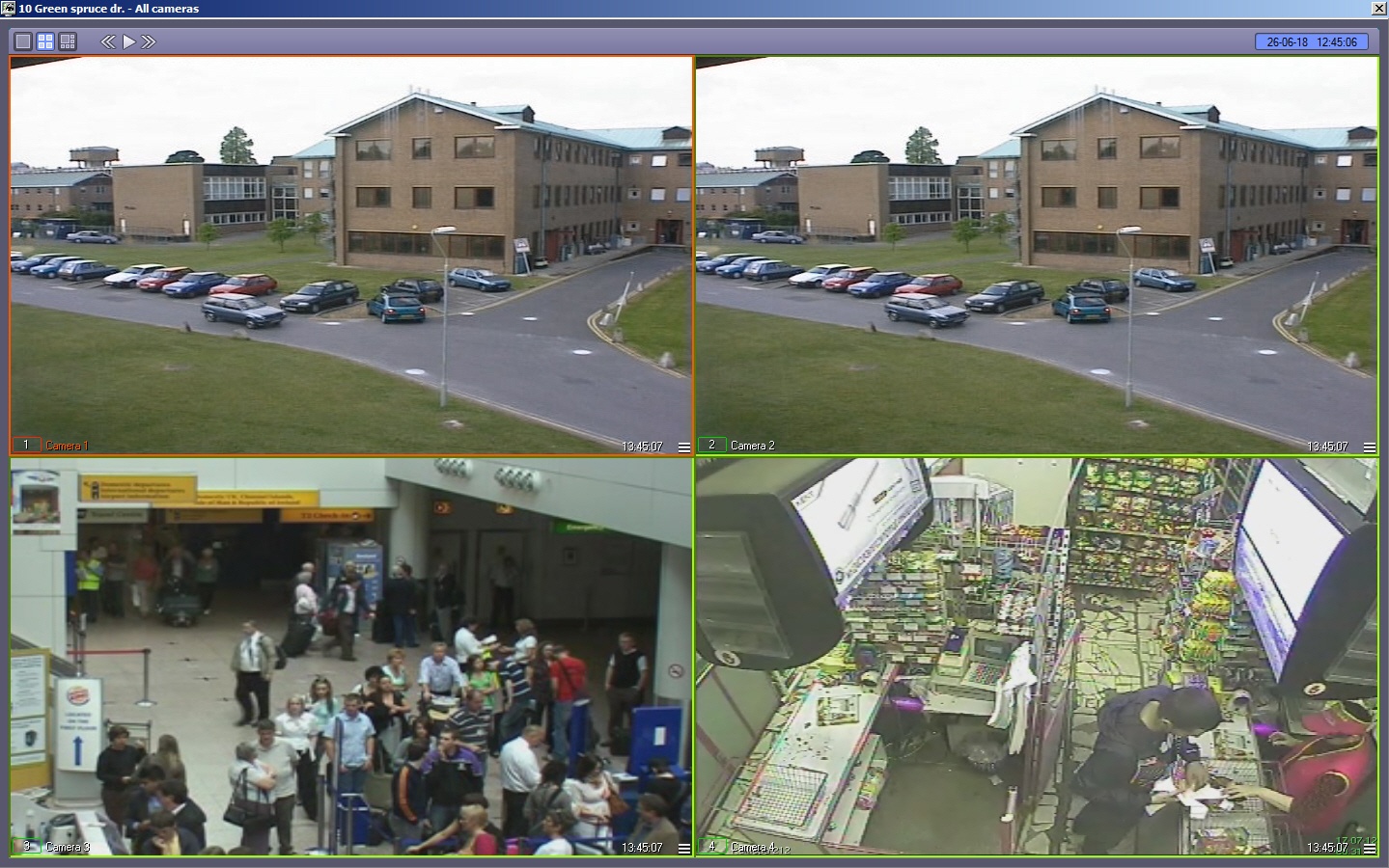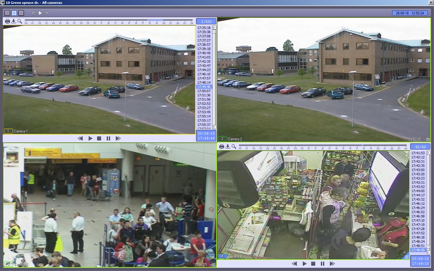 To play back live video and archive from all cameras select the All cameras item in the Video image playback menu of the Control Panel (see Viewing objects' live video and archives).