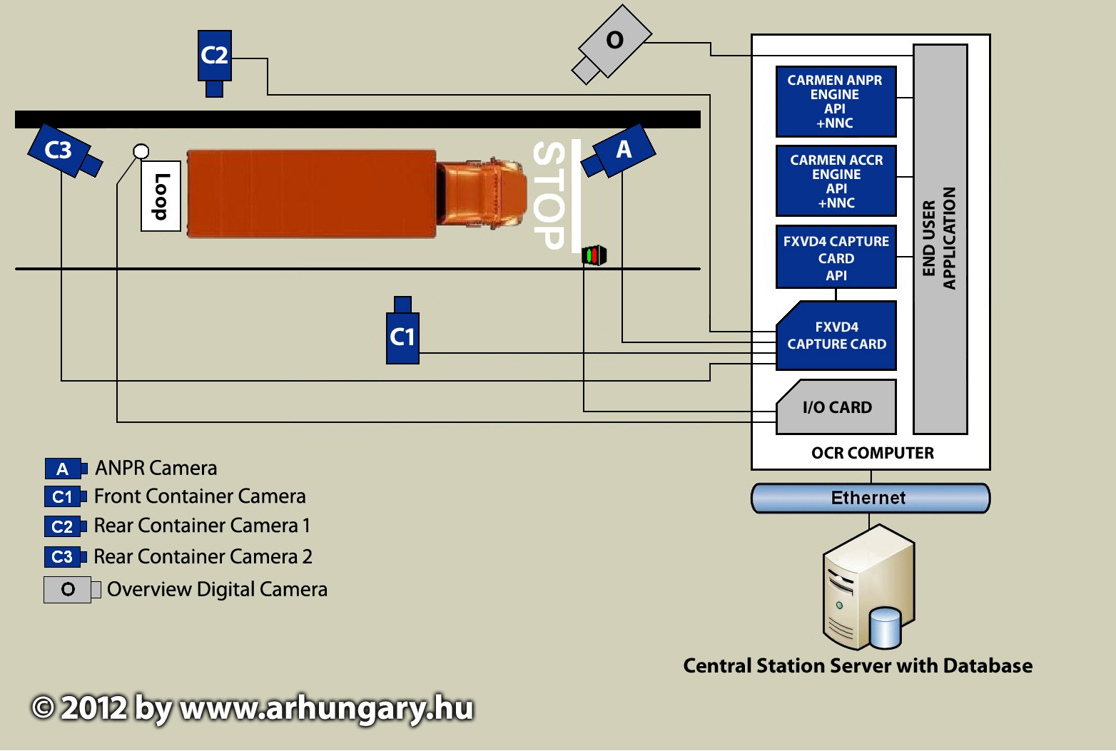 The inductive loop (ther triggering possibilities: laser sensor, microwave sensor, magnetic sensor or infra-red barrier) serves as a sensor, which indicates the arrival of the vehicle. As the vehicle stops at the "STOP" sign, all cameras identify the container code and the license plate of the truck.