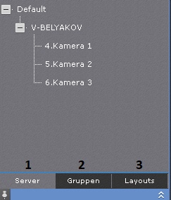 Der Objektbaum im Feld kann als Server (1), Gruppen (2) und Layouts (3) dargestellt werden.