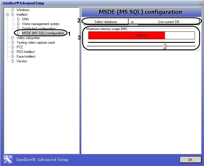 The Maximum memory usage (MB) group will display the amount of space allocated for the selected database (3). - Drag the slider to a position representing the required amount of memory to be allocated for the SQL server (3).