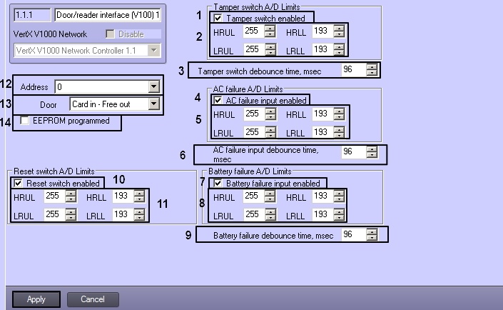 - In the Tamper switch debounce time, msec field, enter the time period (in milliseconds) to be used for fixing (debouncing) the bouncing tamper switch signal(3).