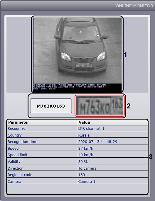 - In the Camera field, the name of the video camera which captured the vehicle is displayed.