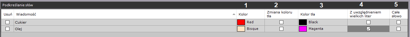 - Aby podświetlić całą linię w razie wystąpienia słowa kluczowego, zaznacz pole wyboru Całe słowo (5).