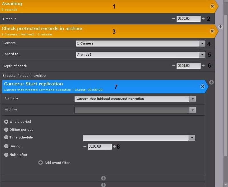 - Select the Replication time for a time interval (8). The replication duration defines the time interval from which protected records have to be copied to another Video Footage. All protected intervals starting within the [starting time of the earliest recording in Video Footage; starting time of the earliest recording in Video Footage + replication duration] range will be copied to Video Footage for replication. Normally, the replication duration has to be equal to the depth of the check defined in Step 3c.