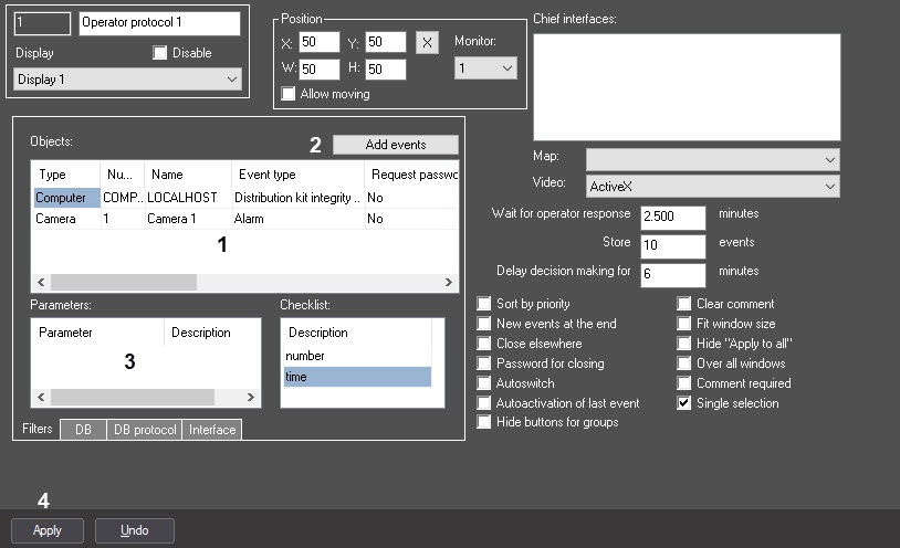 - In the Parameters table, specify additional settings for an object event. These settings are to be displayed in the Operator protocol interface box (3).