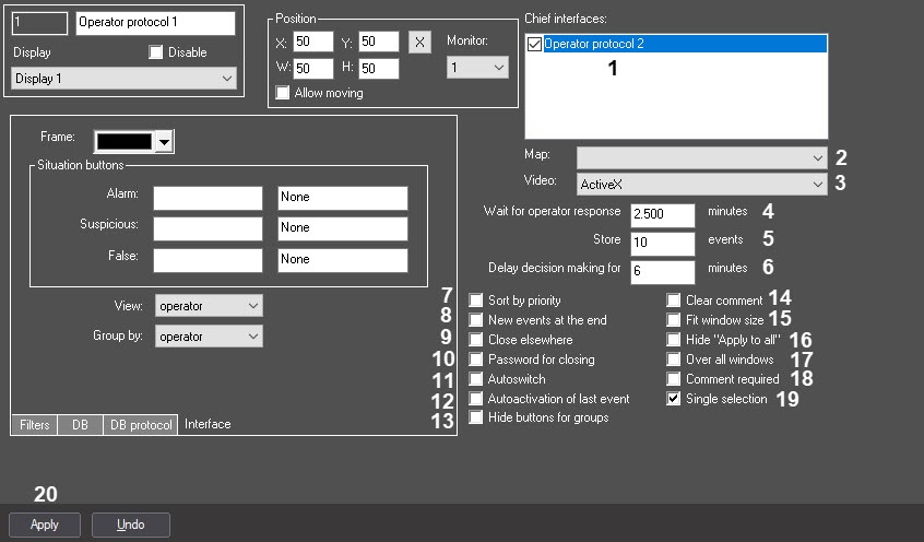20. If it is necessary to prohibit the Operator from selecting multiple events using the Shift and Ctrl keys, set the Single selection checkbox (19).