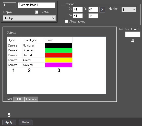 Selecting the objects to include in state statistics and configuring the pixel number is performed as follows: