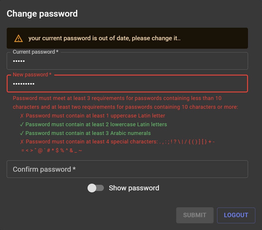 The password must meet at least 3 requirements if the password has fewer than 10 characters, and at least 2 requirements for passwords with 10 or more characters: