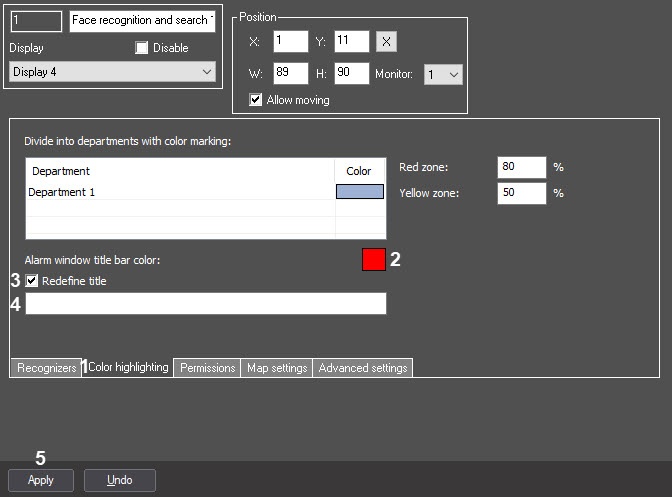 - Go to the Color highlighting tab (1) of the Face recognition and search object settings panel.