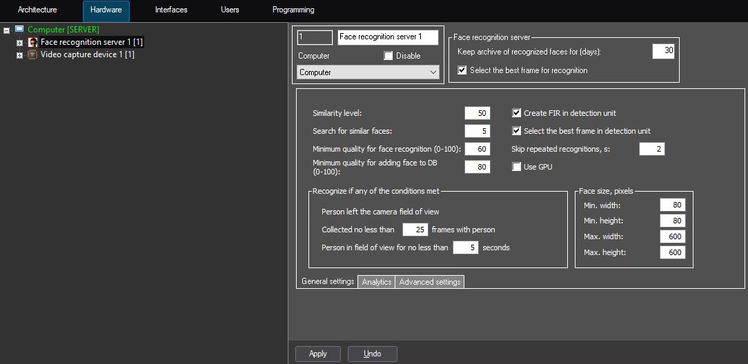 Configuring the Face recognition server object