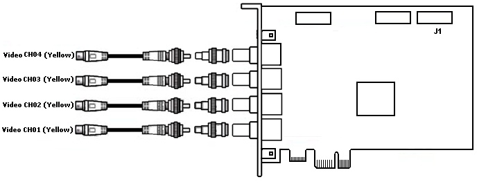 Die Videoeingangskarte VRC6004 verfügt über vier äußere BNC-Anschlüsse. Der Anschluss von Videokameras erfolgt über eine solche Schnittstelle. Es können gleichzeitig bis zu vier Videokameras angeschlossen werden. An Schnittstelle J1 wird die Sensor/Relais-Karte angeschlossen.