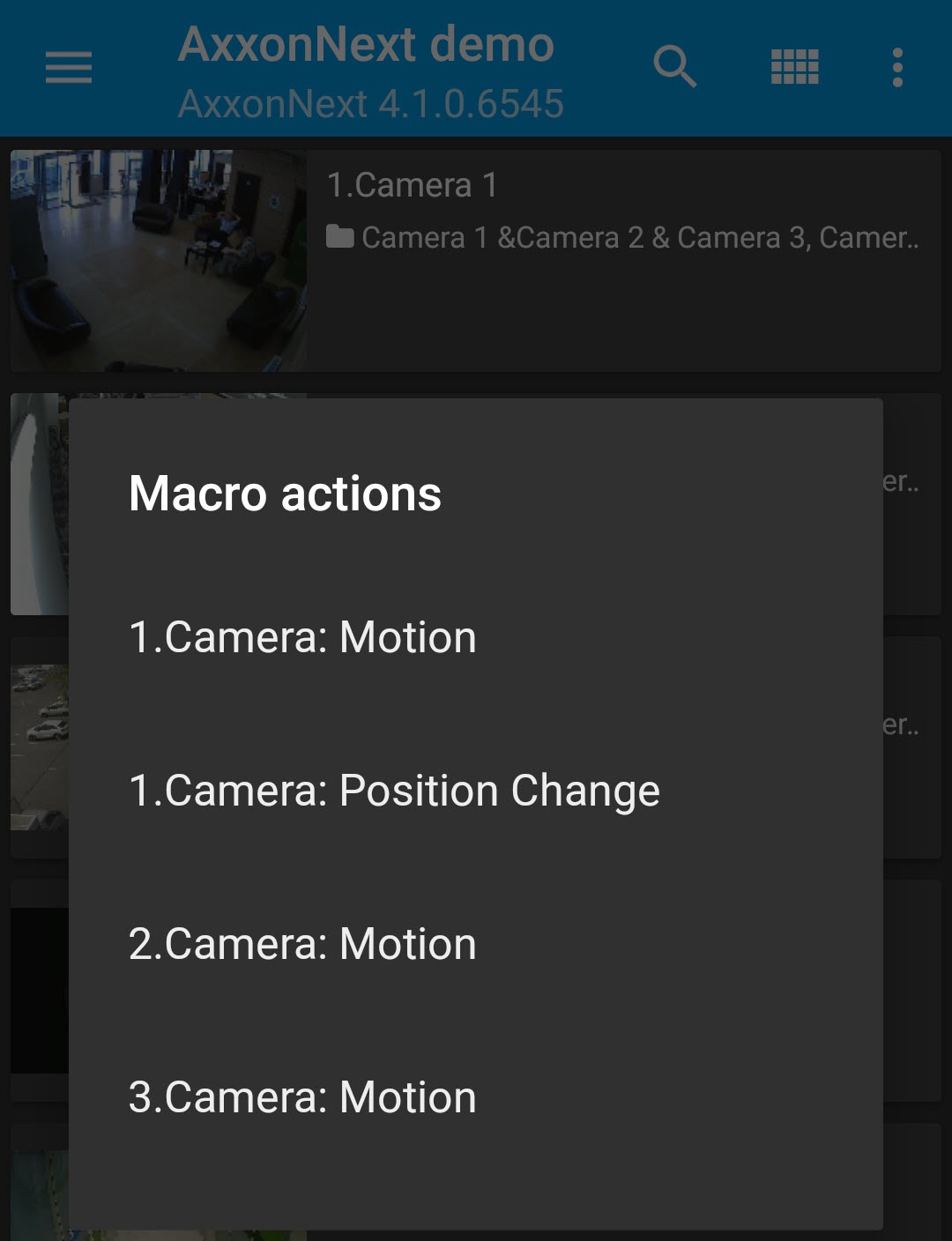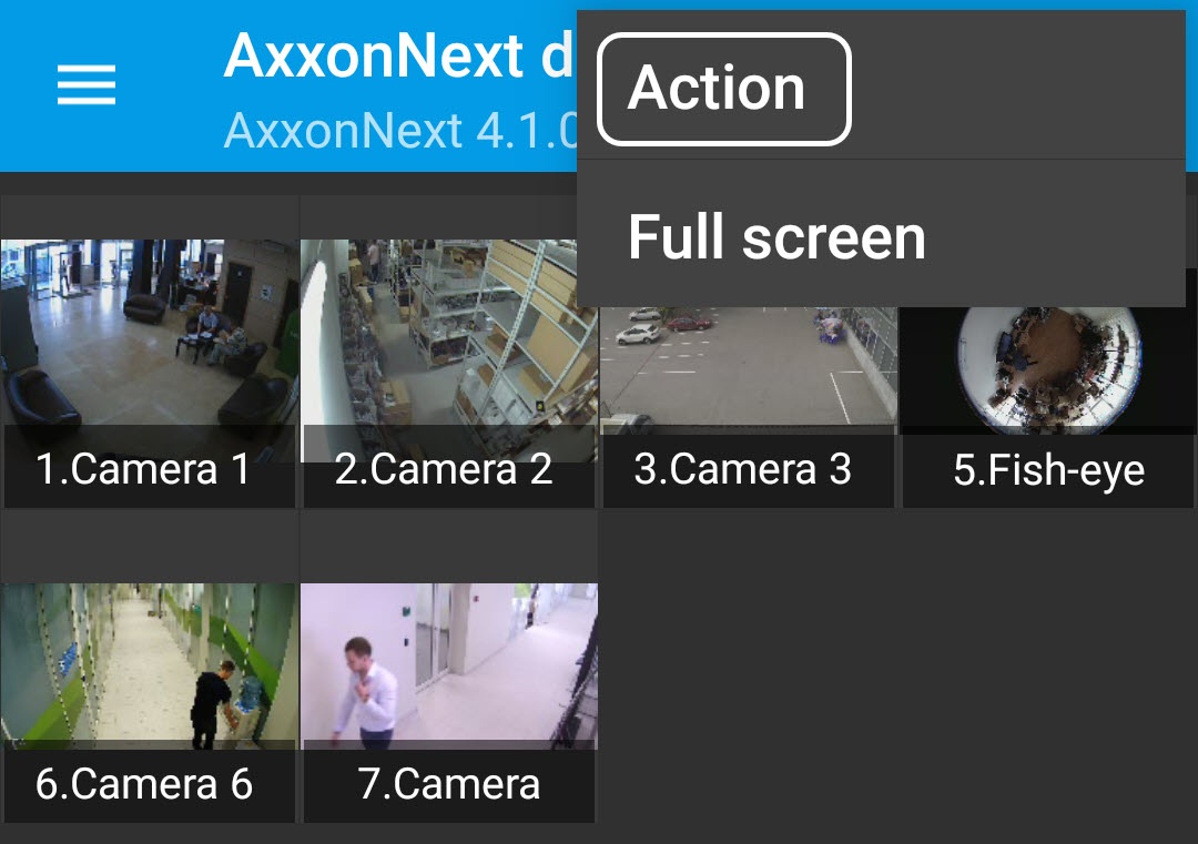 - Click Displaying and searching for cameras in Android Mobile Client) or in the video playback mode (see Viewing live video in the Android mobile client), and select Action item from the menu.