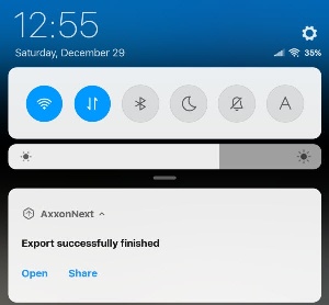 The video is exported to the following path: /Internal memory/Movies/AxxonNext/. The information about the archive date, Server name and video camera name will be added to the video.