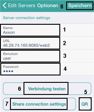 Außerdem kann ein QR-Code mit Servereinstellungen generiert werden. Dazu müssen Sie die Einstellungen des Servers speichern, zu ihm zurückkehren und auf die Schaltfläche QR tippen (5).