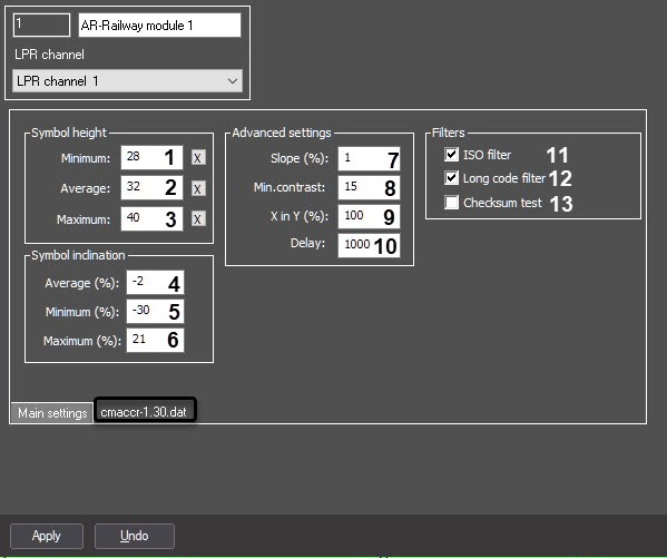 1. Set the ISO filter checkbox (11) if it is necessary to enable the ISO carriage numbers filtering. When reading a number that consists of 11 symbols, the recognition module will attempt to read the ISO code (examples of ISO codes: GB4310, 22G1).