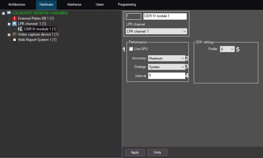 6. The Profile drop-down list (5) displays the license plate recognition quality profile. At the moment, only profile 6 is used, which provides high performance (high processing speed and low CPU usage).