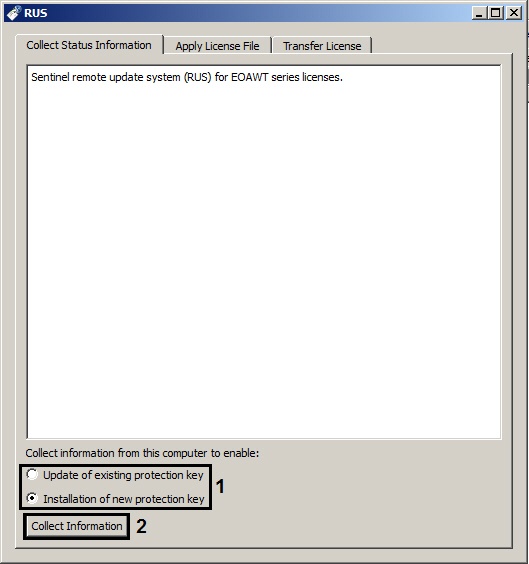 7. Set the Collect information from this computer to enable: switch into the Installation of new protection key position in case if license for a "clean computer" is needed, i.e. if there is no demo license on it, or to the Update of existing protection key position, if demo license is already in use (1).
