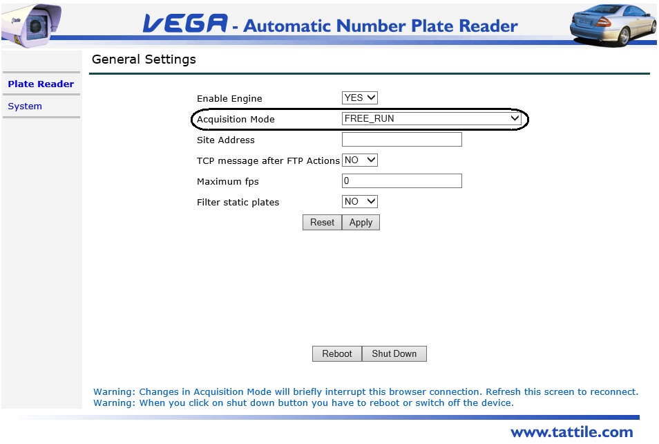 - Go to the Plate reader tab in the camera settings program and select the General item of menu. From the Acquisition Mode drop-down list select the FREE_RUN value to send data by camera.