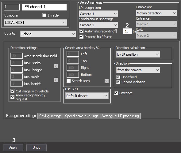 In the field next to the checkbox (2), specify for how many seconds the video must be recorded after LP number recognition.